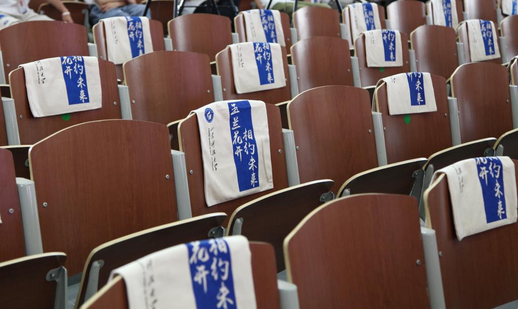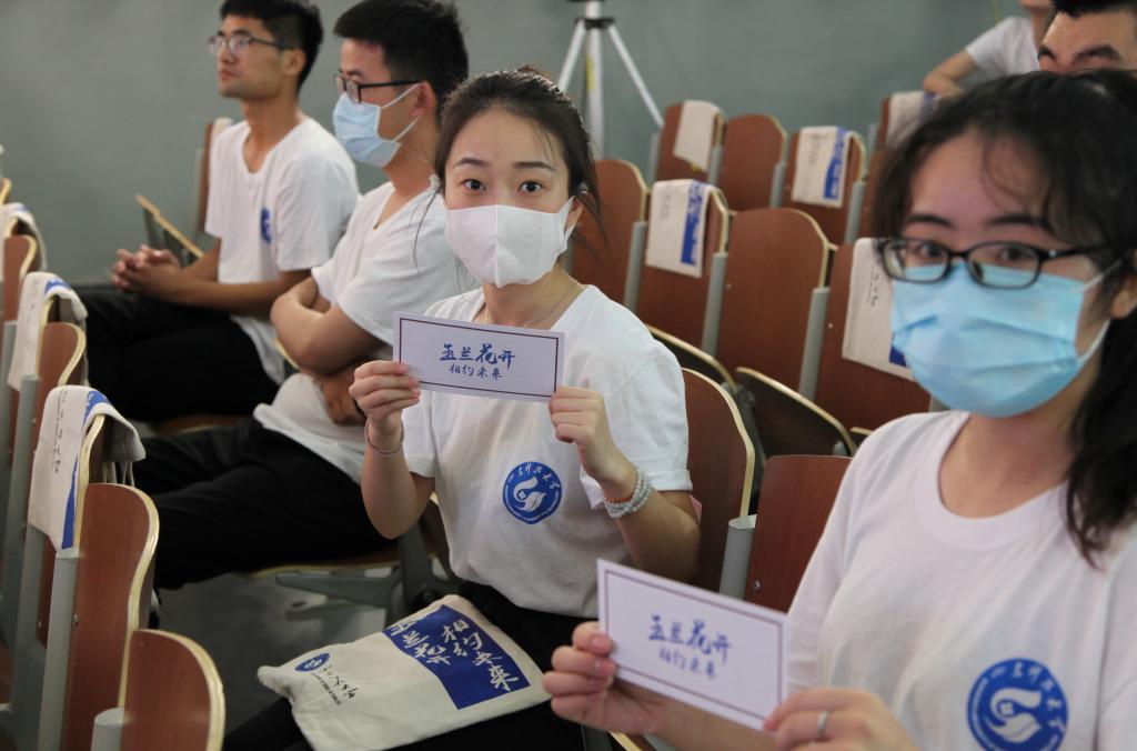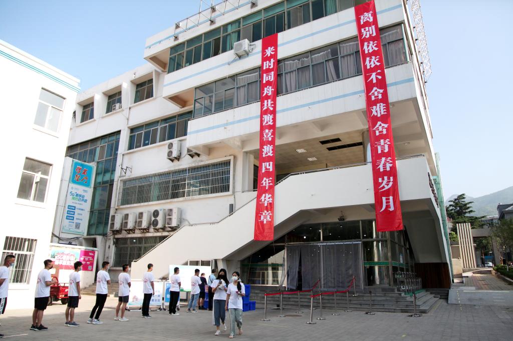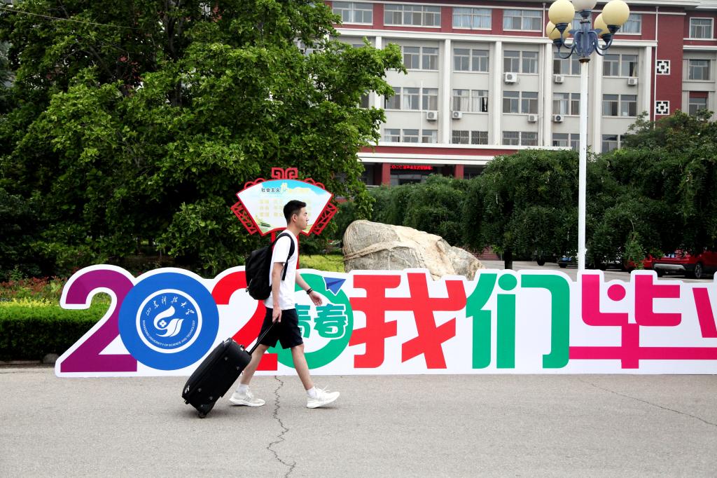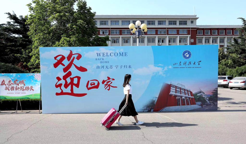 毕业生返校,在写有“欢迎回家”和“山河无恙,学子归来”的巨大幕布前走过。