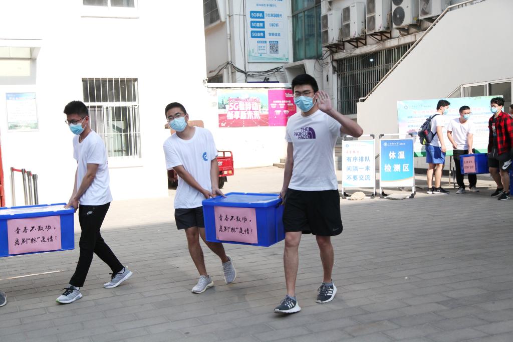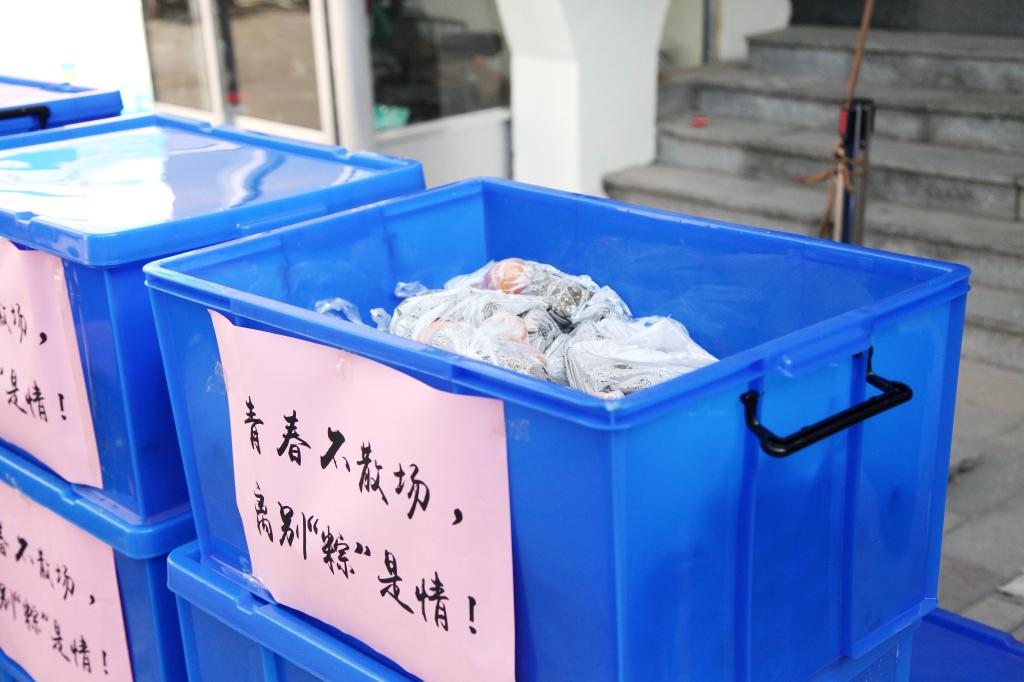 毕业生在食堂门口有序排队领取粽子和鸡蛋。