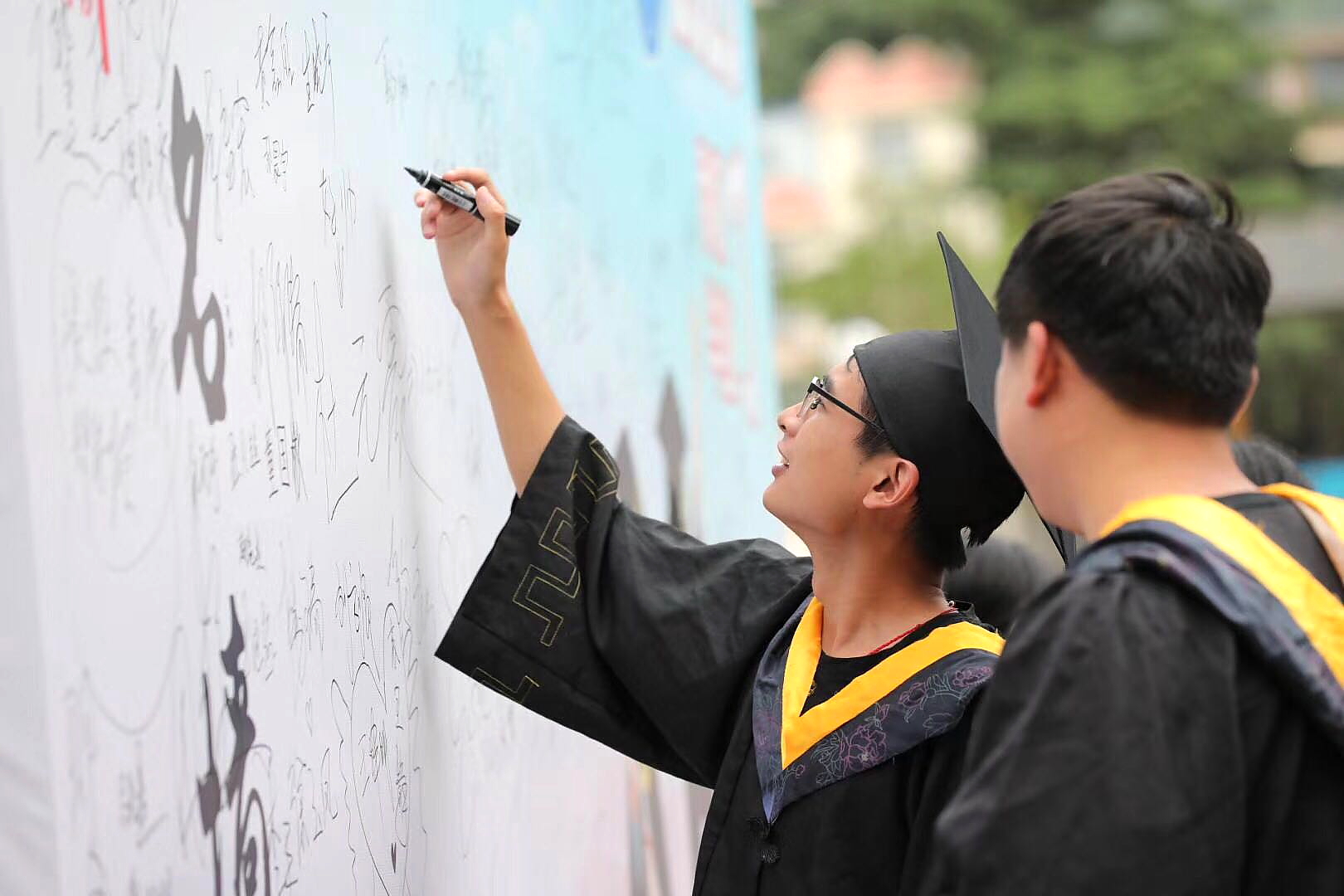 签名墙上,毕业生郑重留下自己的名字。科大已将你们的名字镌刻于心,而你们也已与科大融为一体。