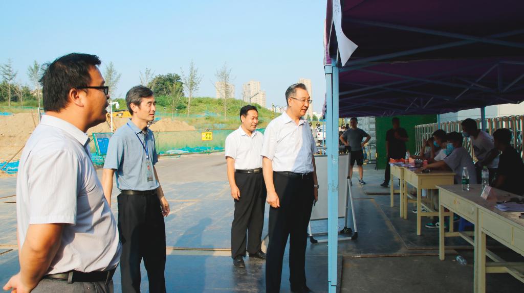 在西校园南部地块施工现场,王少鹏充分肯定了各部门工作人员牺牲假期坚守岗位的奉献精神,并要求大家严格落实相关安全措施,始终把保障师生身体健康放在第一位,扎实做好开学各项准备工作,确保秋季学期全面复学复课、开学工作平稳有序。(文:张田 图:任卫兵)