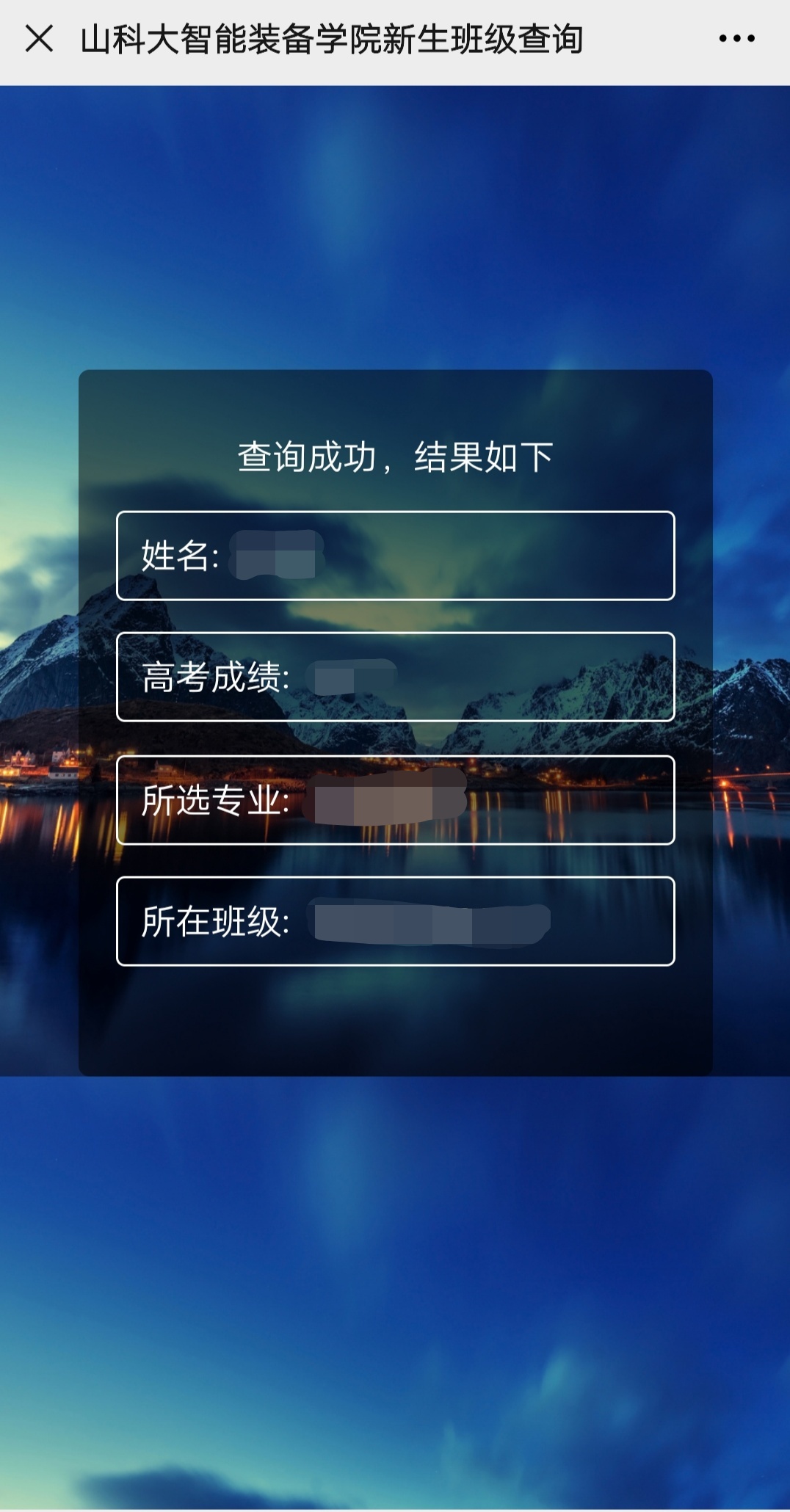 智能装备学院2020年录取本科新生900余人,共29个班级,学生人数多,生源范围广,且加之疫情影响,往年在展板上张贴分班信息的方式已经不适于新的需求和要求。为帮助新生更简便、快捷的查询其所在班级,确保新生安全、有序入学,智能装备学院利用自身专业优势,开发了新生班级查询系统。