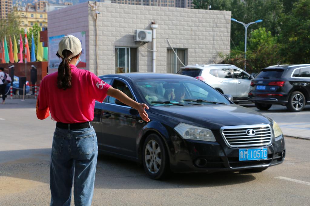 一位交通疏导人员的背影,用心迎接新生,用爱开辟航道。(文:仝帆 图:张同庆)