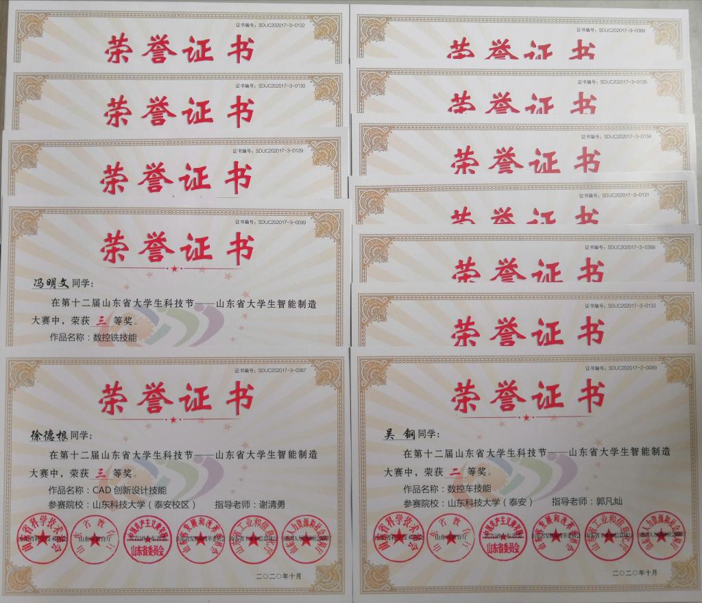 近日,第十二届山东省大学生科技节-山东省大学生智能制造大赛决赛落下帷幕。智能装备学院12支参赛队伍全部获奖,其中二等奖1项(参赛作品:数控车技能,参赛学生:机械电子高本17-1吴钢,指导老师:郭凡灿),三等奖11项。