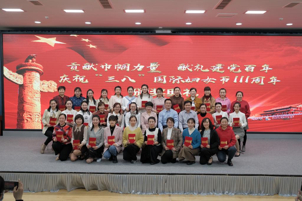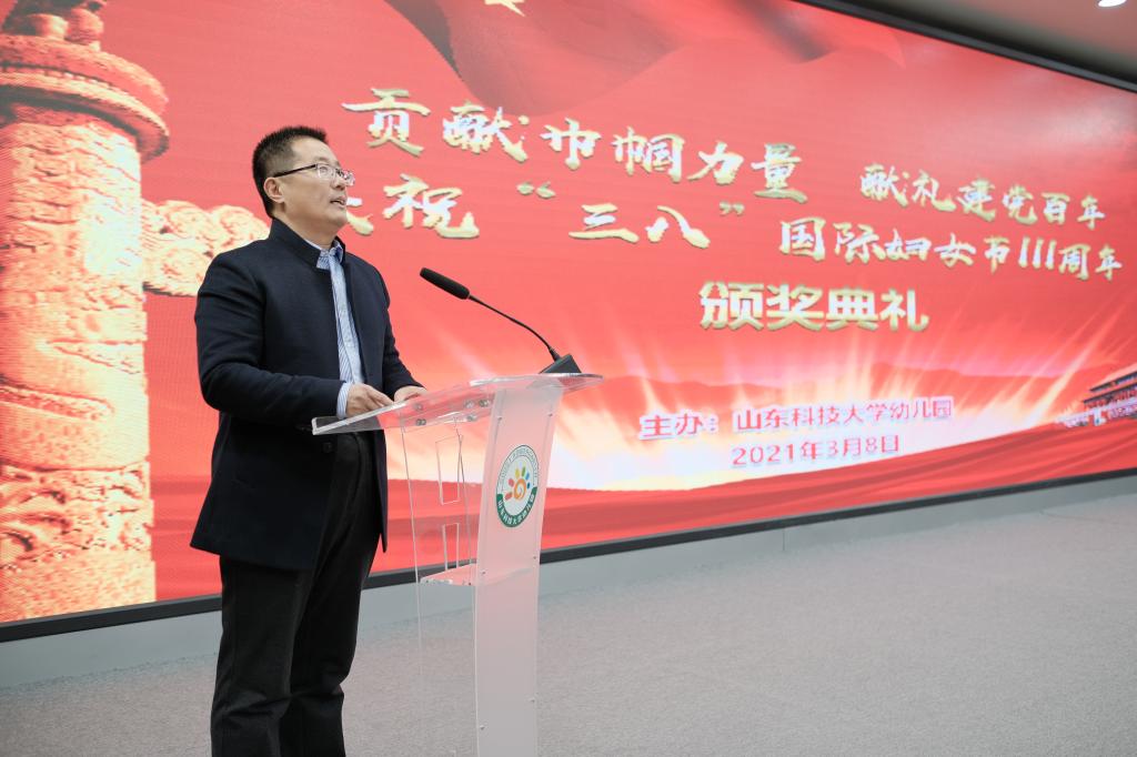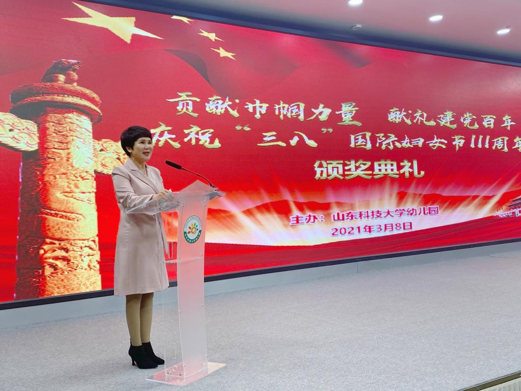 3月8日,3044永利集团官网幼儿园举行庆祝“三八”国际劳动妇女节颁奖典礼。颁奖典礼以“贡献巾帼力量,献礼建党百年”为主题,泰安校区后勤管理部主任张禄军,副主任梁荣芹、朱庆豪出席活动并为获奖教师颁奖。