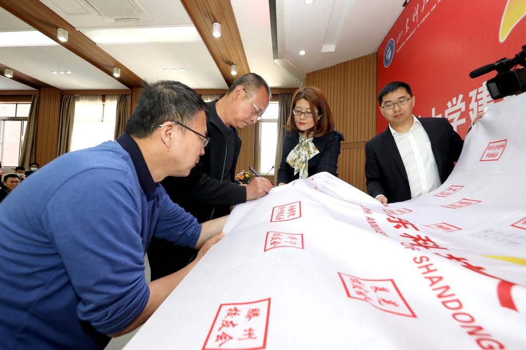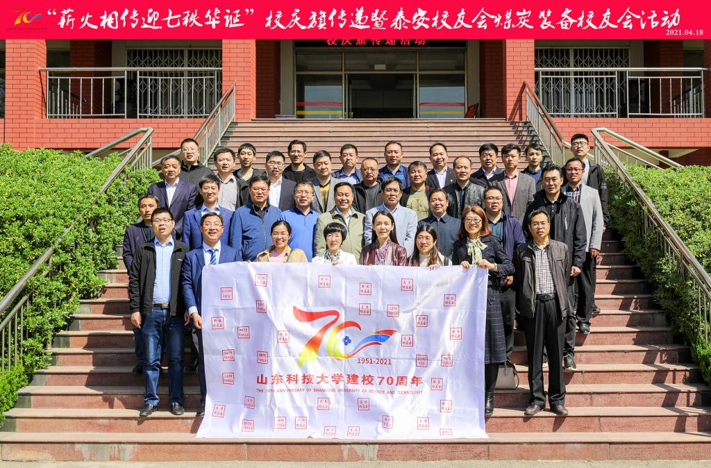 4月18日,“薪火相传迎七秩华诞”校庆旗泰安传递活动在泰安校区举行。校区管委副主任方亨福,校区两委委员、党政办公室主任许志伟,泰安校友会代表、潍坊校友会代表及在校学生代表参加活动。