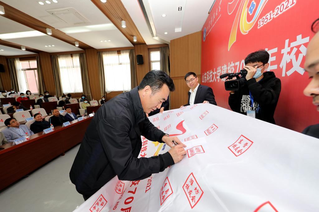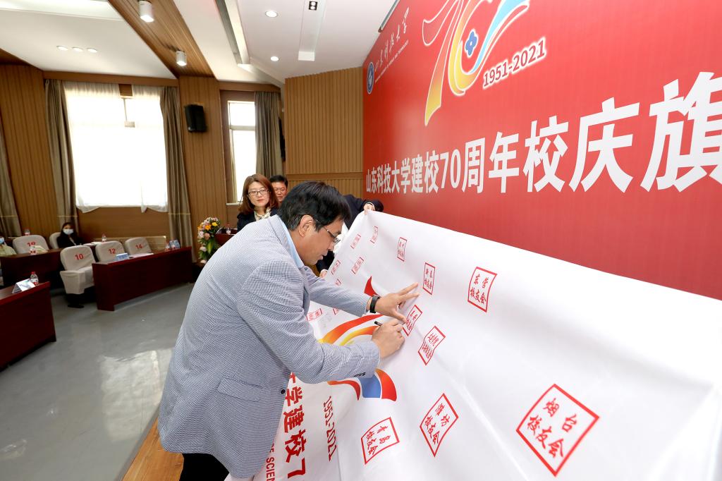校庆旗在泰安校友会4名代表的护送下来到主席台进行展示,泰安校友会代表单保华、煤炭装备校友会代表孙福军、土建学院泰安校友会代表张春峰分别在校庆旗上写下对母校70周年华诞的祝福词。随后,泰安校友会将校庆旗郑重传递给潍坊校友会。