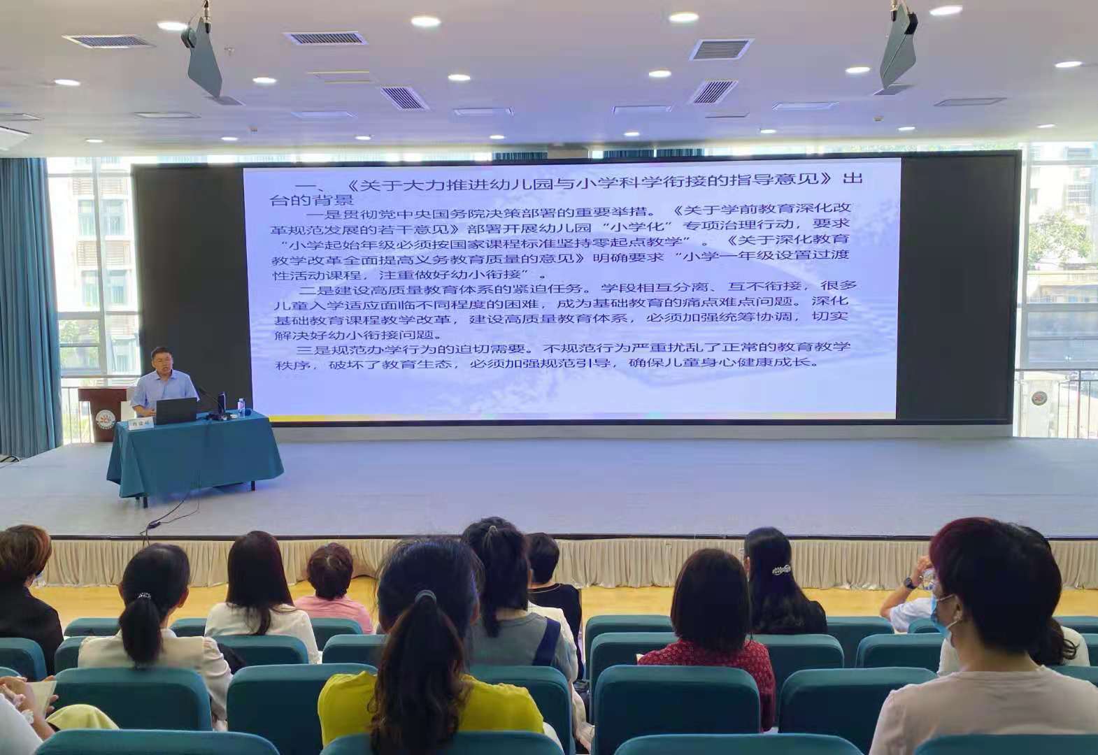 会议邀请山东省有突出贡献的中青年专家、国家教学成果评审专家蒋建敏教授作了题为《幼小衔接关键是什么》的报告。蒋教授从国家出台幼小衔接的背景谈起,结合生动具体的事例就幼小衔接应遵循的基本原则、工作举措、幼儿园和小学应如何做好幼小衔接等方面进行了阐述,突出强调要做好身心准备、生活准备、社会准备、学习准备这四个部分的全面准备,帮助幼儿顺利过渡到小学。