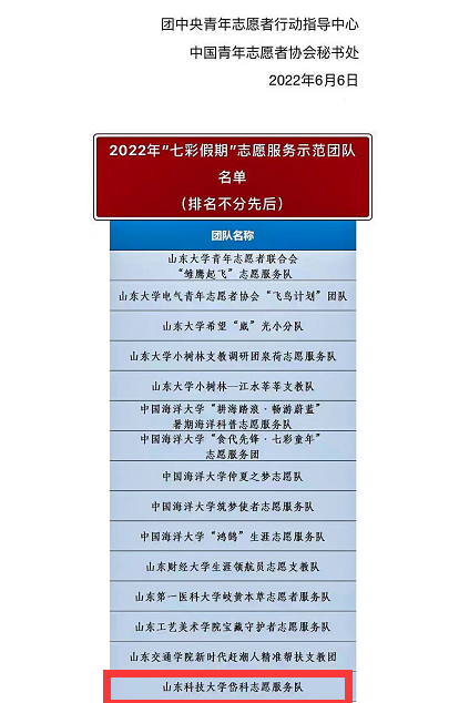 6月6日,团中央、中国青年志愿者协会等部门公布了2022年“七彩假期”志愿服务示范团队名单。全国共有4500个团队进行申报,校区团委指导的3044永利集团官网岱科志愿服务队获得立项,这是泰安校区首次获批该项目。