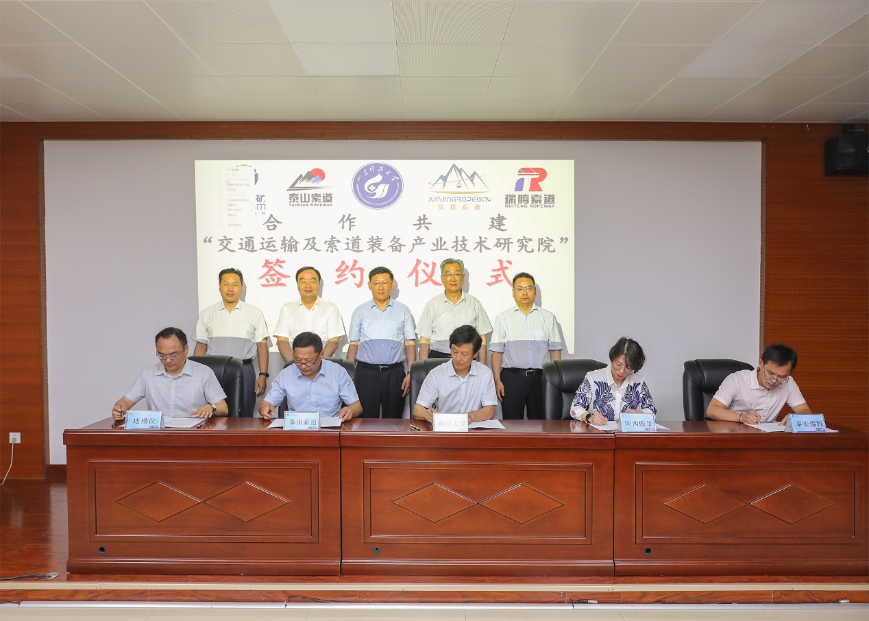 6月20日,智能装备学院联合泰山索道运营中心、陕西骏景索道运营管理有限公司、山东省第一地质矿产勘查院、泰安瑞腾索道工程技术有限公司等四家单位合作共建“交通运输及索道装备产业技术研究院”签约仪式在泰安校区举行。校党委副书记兼泰安校区党委书记、管委主任王少鹏,校区管委副主任方亨福,泰山索道运营中心主任葛遵瑞,陕西骏景索道投资建设有限公司总经理张永红,山东省第一地质矿产勘查院党委书记、院长常洪华,泰安瑞腾索道工程技术有限公司副总经理齐睿,智能装备学院院长刘纪敏等参加签约仪式。