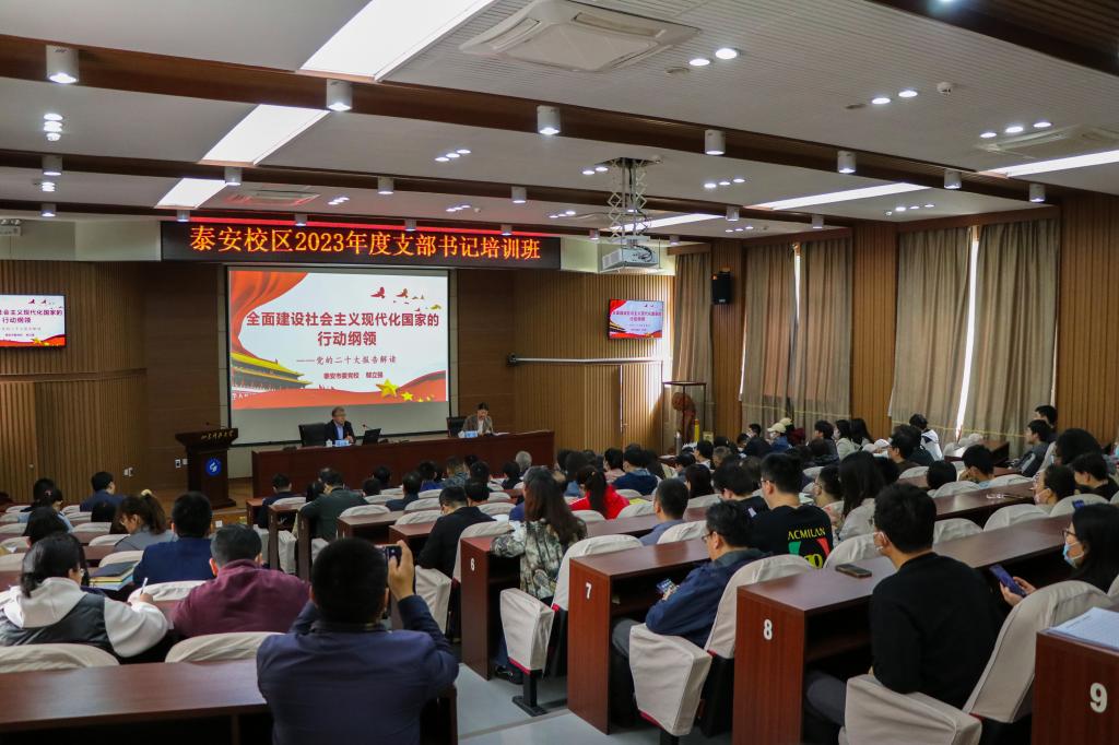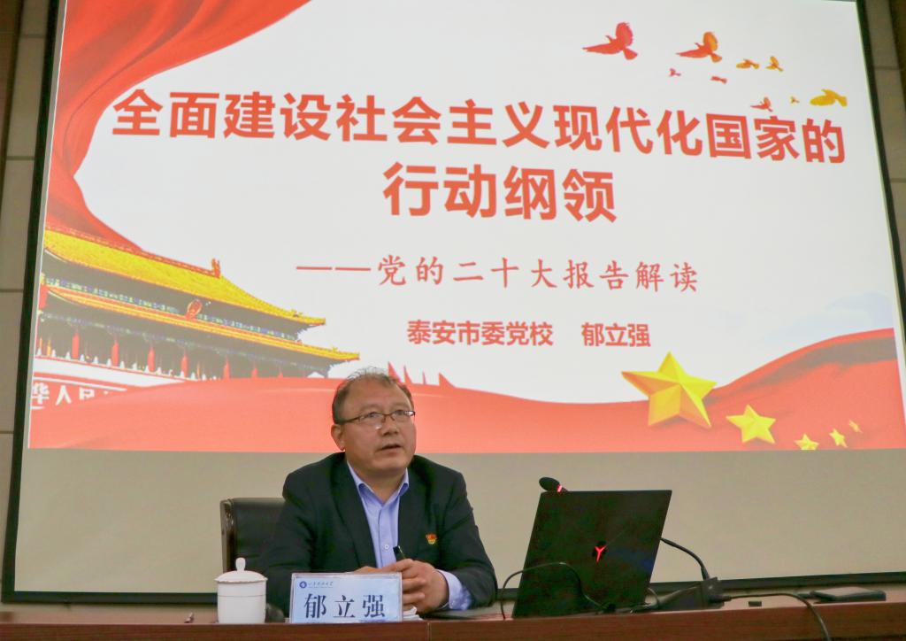 为深入学习贯彻党的二十大精神,持续营造浓厚学习氛围,4月15日,校区党支部书记培训班邀请泰安市委党校郁立强教授来校作学习贯彻党的二十大精神报告。报告会由校区党政办公室副主任张田主持,校区党支部书记、支部委员等120余人参加报告会。