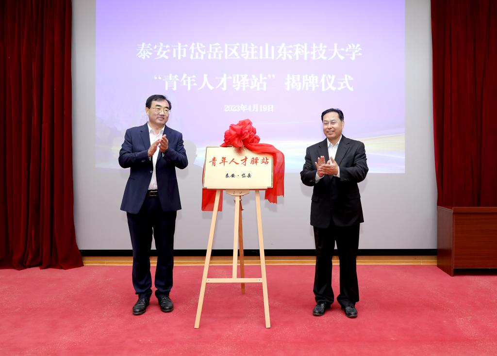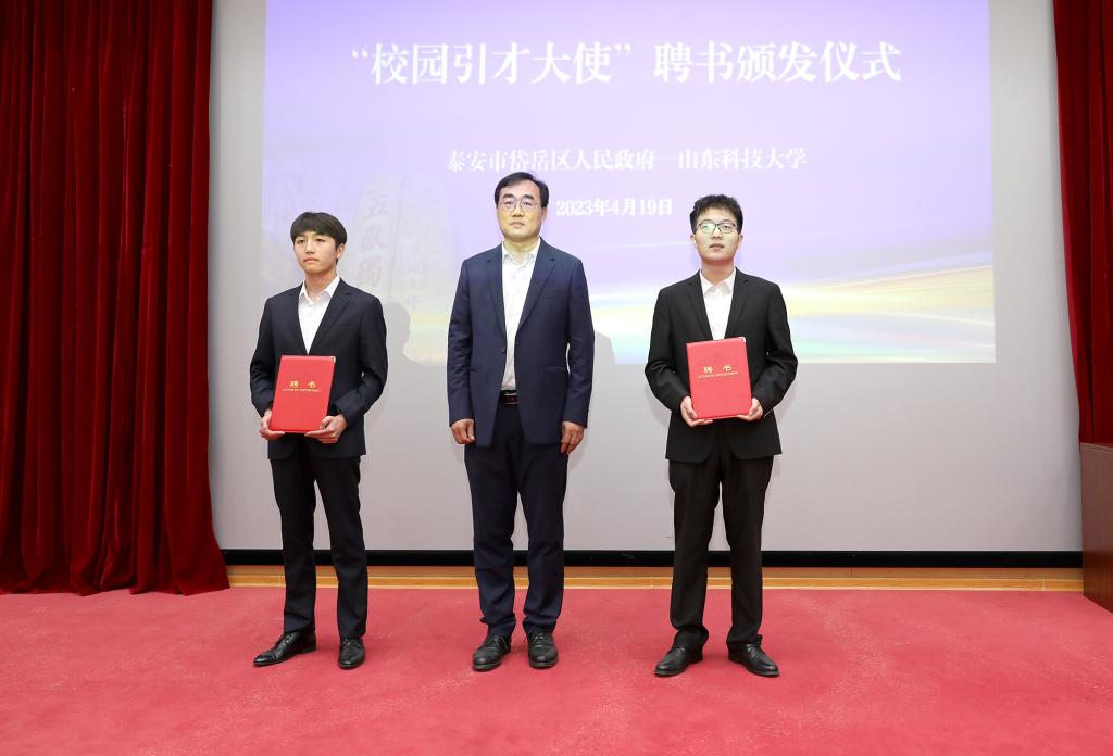 戴东宝和吴钦波代表双方签署了人才就业合作协议,方亨福和张和江为岱岳区在我校设置的“青年人才驿站”揭牌,张和江为岱岳区在我校聘任的学生“校园引才大使”颁发了聘书。