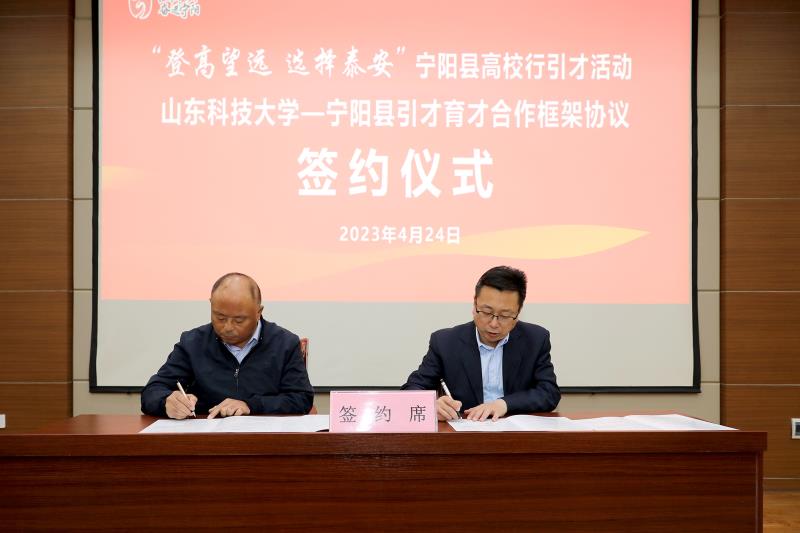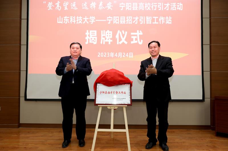 牛进社和李洪涛代表双方签署了人才就业合作协议,方亨福和赵磊为宁阳县在校区设置的“宁阳县招才引智工作站”揭牌,李洪涛还为宁阳县在校区聘任的学生“校园招才引智大使”颁发了聘书。