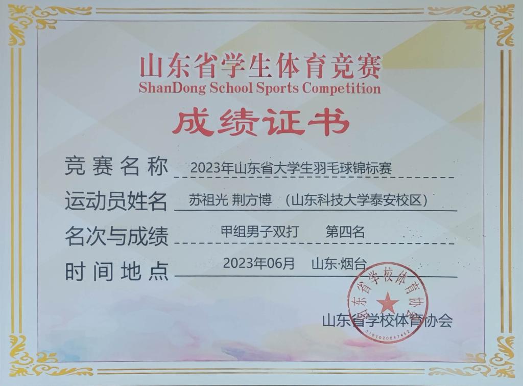 校区大学生男子排球队在有28支代表队457人参赛的男子组比赛中,获得甲组第8名,并获得2023年山东省大学生排球锦标赛“二等奖”和“体育道德风尚奖”;首次参赛的校区羽毛球队在有32支代表队347人参加的男子甲组男双比赛中获得第4名的好成绩,校区羽毛球代表队还荣获2023年山东省羽毛球锦标赛团体总分“二等奖”,为学校和校区赢得荣誉。
