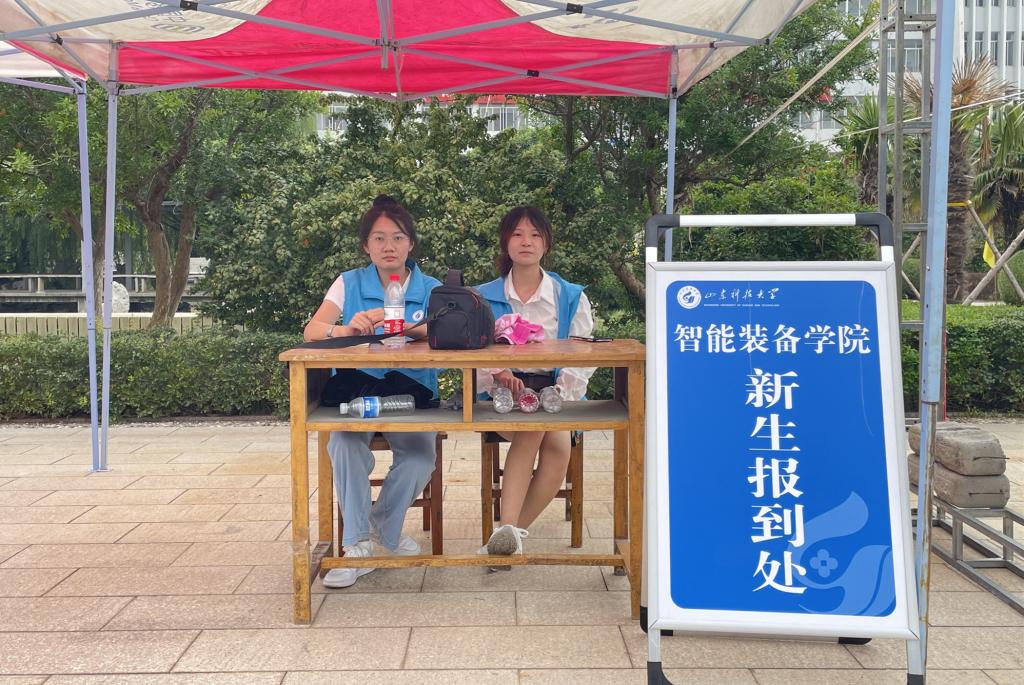 志愿者在校门口值班,为提前来校新生服务(智能装备学院供图)