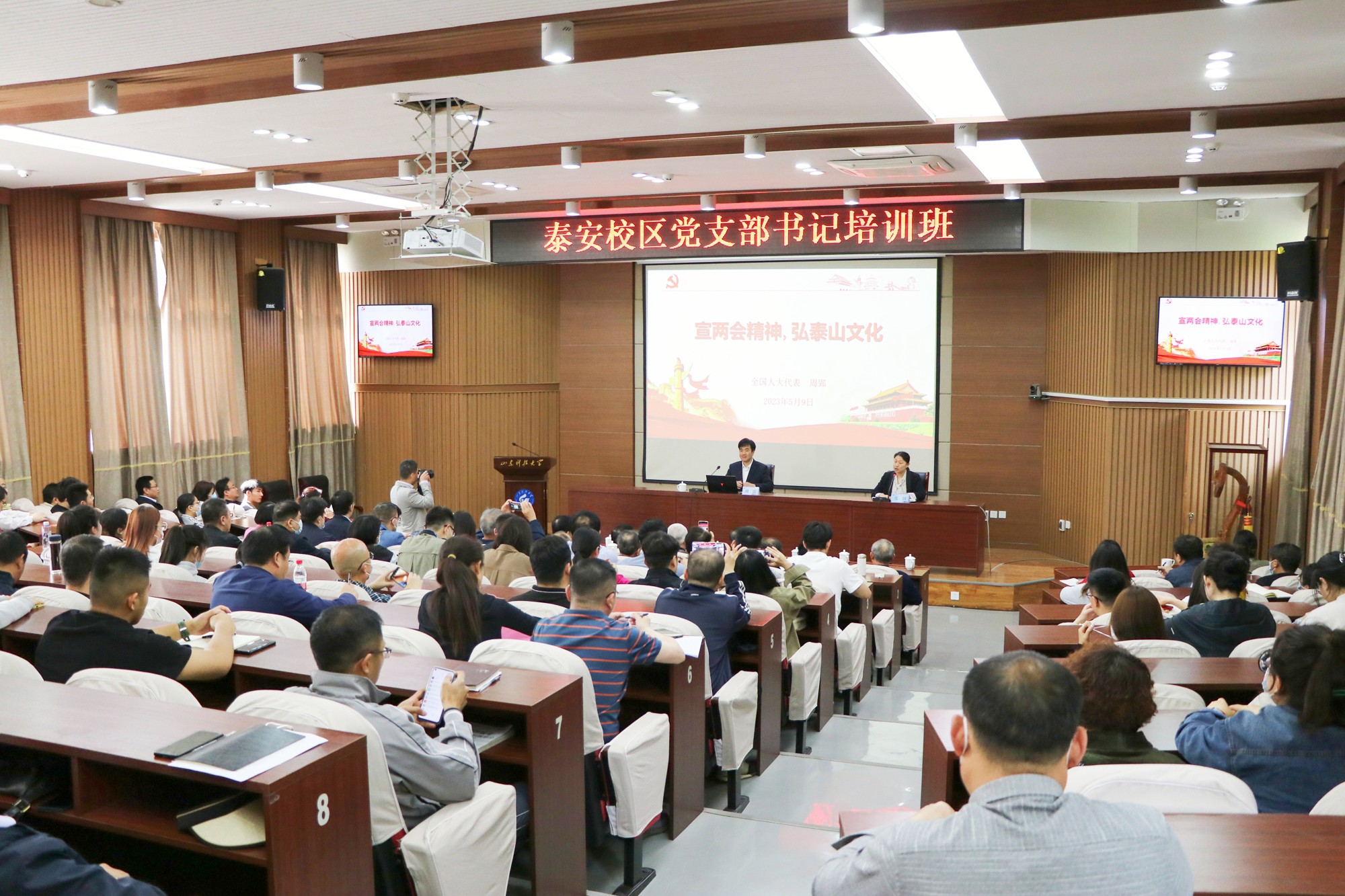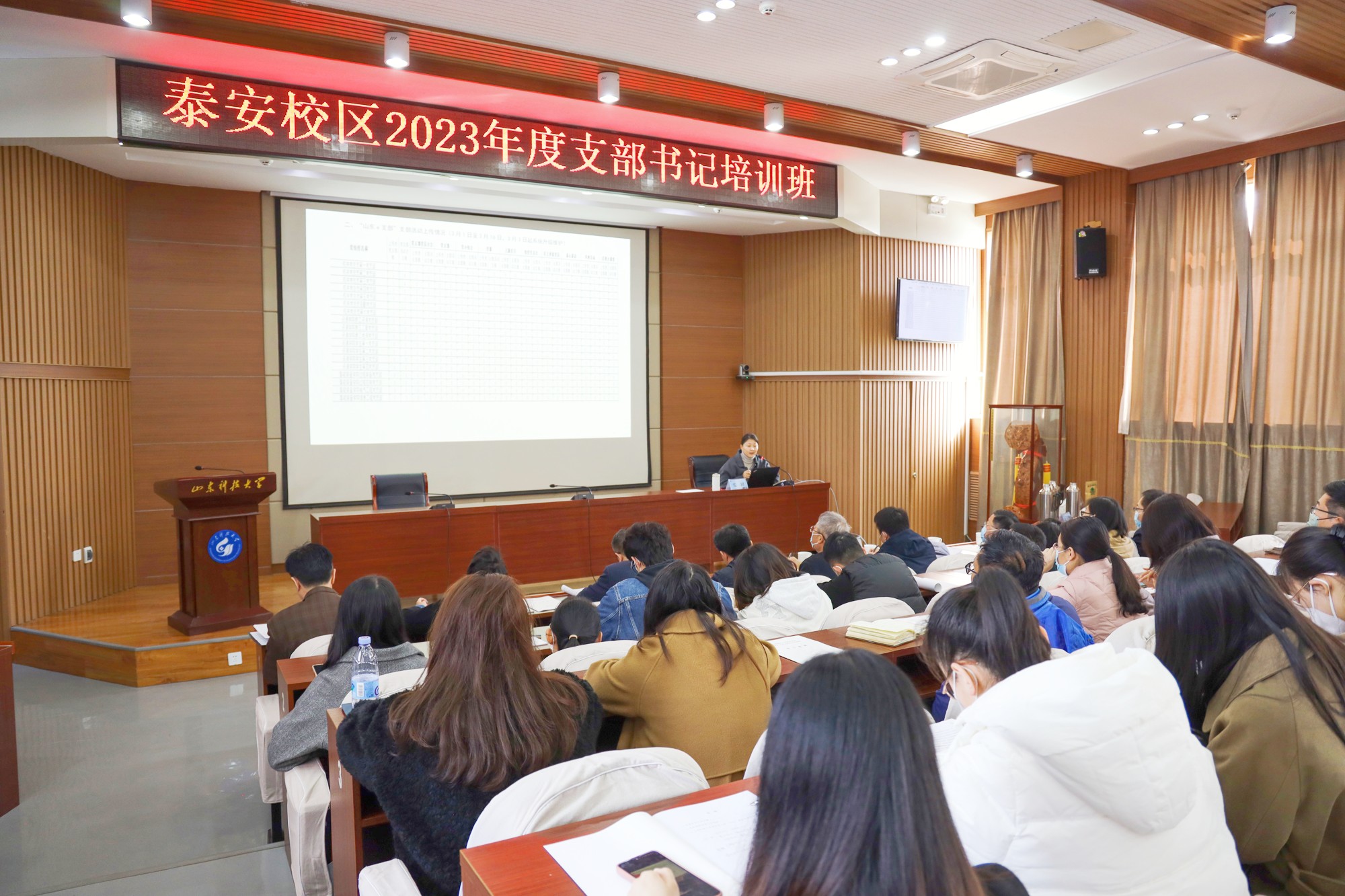 培训遵循“干什么学什么,缺什么补什么”的原则,科学制定培训计划,精心设置课程。培训班结合党建工作进展情况,分阶段、分专题精准组织培训,采用专家讲授、研讨交流、现场观摩、“线上+线下”学习等多种方式进行。培训期间,邀请泰安市委党校专家系统梳理和全面解读党的二十大精神;邀请全国人大代表宣讲两会精神与泰山文化;举办廉洁教育专题报告会;组织参训人员赴泰安党支部工作指导中心开展观摩学习;安排党务干部对“党支部书记职责”“发展党员工作流程”“灯塔-党建在线”平台功能等进行系统讲解,现场进行答疑解惑。