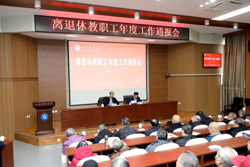 1月20日,学校在泰安校区召开离退休教职工年度工作通报会,校长曾庆田出席会议并通报学校2023年主要工作情况,副校长兼泰安校区党委书记、管委主任徐方全主持通报会。党委学校办公室、组织部、人事处、离退休工作处主要负责人,泰安校区相关负责人,泰安校区各部门、各单位主要负责人及离退休老同志代表参加会议。