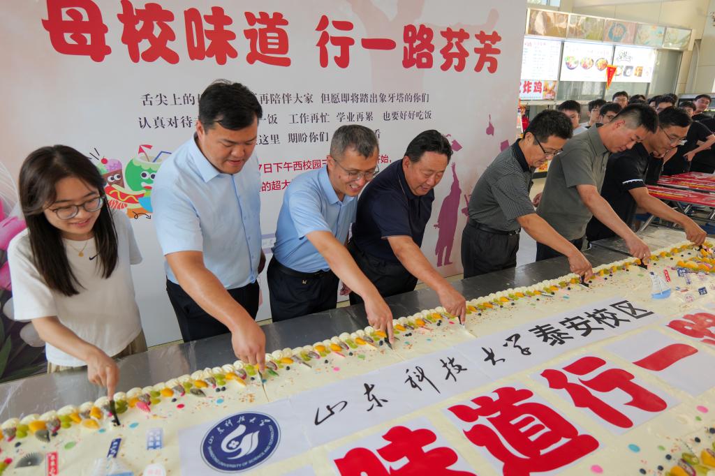 除了免费的大蛋糕,现场还准备了麻辣小龙虾、水果捞、各种烤串等几十种特色小吃供同学们选择。师生在餐厅内围坐在一起,品尝美食,回顾着大学时光里快乐的过往点滴,诉说着即将离别的不舍之情。看到热烈温馨的现场,校区管委副主任兼后勤管理部主任逄杰文说到:“用美食烙印住毕业生珍贵的同窗情、师生情、母校情,美食是有记忆的,一份毕业餐,能让毕业生感受到来自母校的温暖与真情,为他们留下不可磨灭的美食记忆,这样的送别方式独特而又温馨。希望每一位毕业生都能够带着学校的这份心意,满怀信心地迎接未来的挑战,勇敢地迈向人生的下一个阶段”。(文:尹德峰)