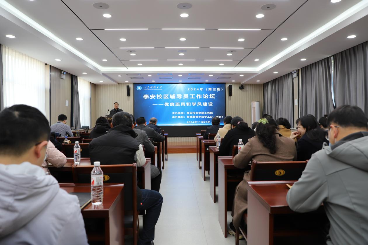 11月20日,由泰安校区学团工作部主办、智能装备学院学工办(团委)承办的泰安校区辅导员工作论坛第三期在西校园办公楼301会议室举办,论坛聚焦“优良班风和学风建设”主题,探讨打造优良班风,推进学风建设的方法路径。校区管委副主任兼学团工作部主任戴东宝,全体学生工作干部参加论坛,论坛由智能装备学院党委副书记兼副院长王衍国主持。
