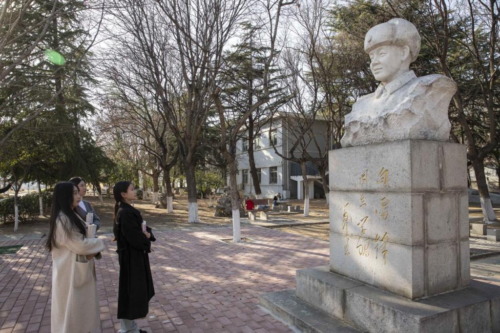 雷锋像前,阳光洒落,青年们品读经典,感悟精神力量