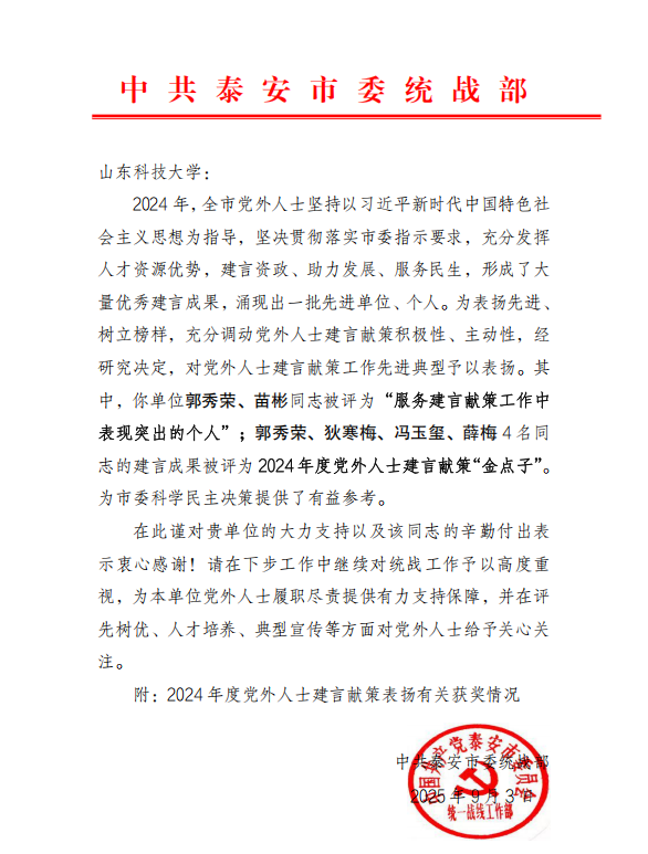 9月3日,中共泰安市委统战部发函对2024年学校党外人士优秀建言成果,先进单位、个人予以表扬。