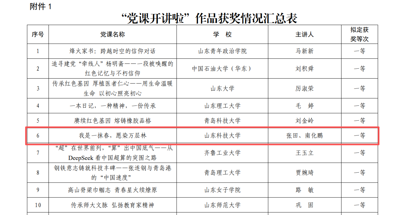 近日,中共山东省委教育工委公布2025年全省高校“党课开讲啦”党员教育系列活动评选结果,校区机关党总支、离退休工作处党委选送的党课《我是一抹春 愿染万层林》(主讲人:张田、南化鹏)荣获一等奖,这也是山东省委教育工委举办此项系列活动以来,学校取得的历史最好成绩。