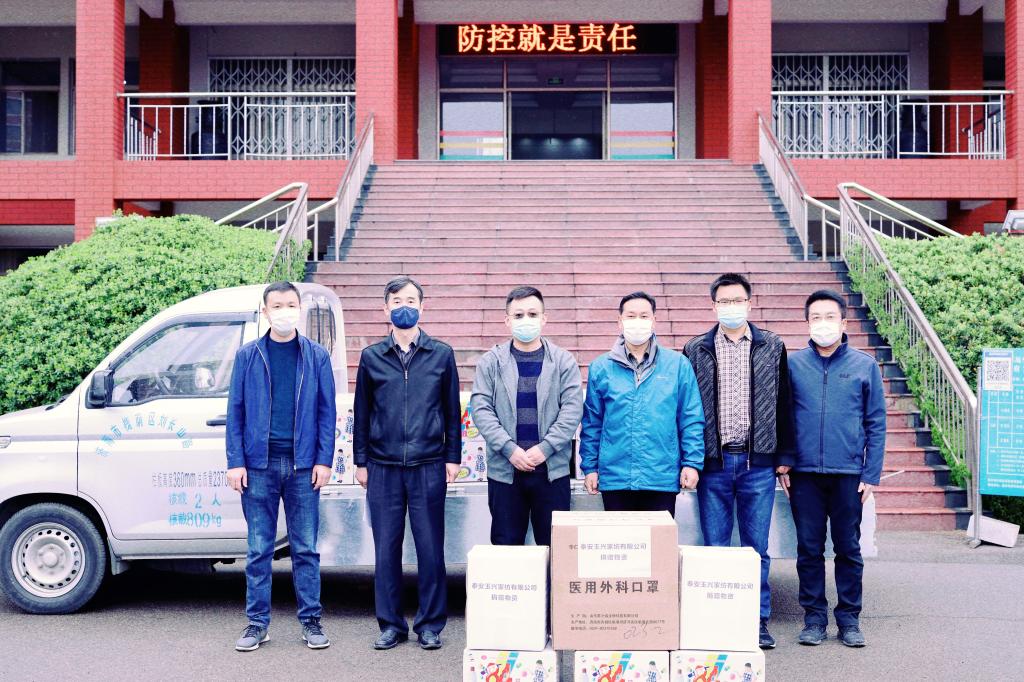 4月2日上午,泰安玉兴家纺有限公司负责人冒着小雨赶到校区,向校区捐赠了防护服30套、医用外科口罩2000个、84消毒液50箱等共计一万余元的疫情防控物资。校区管委副主任方亨福代表校区接受捐赠,对公司的爱心捐赠表示衷心感谢。