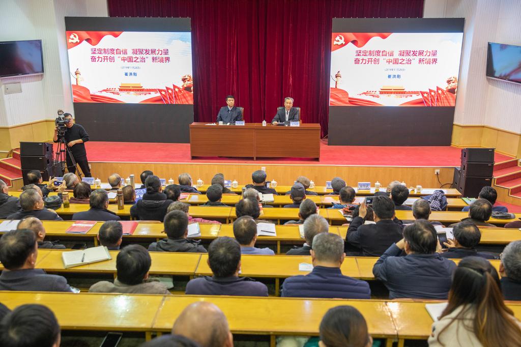崔洪刚结合自身经历和工作实际,介绍了近年来国家发展取得的辉煌成就和人民生活发生的巨大变化,阐明了全会的重大意义,阐述了中国特色社会主义制度自信的历史逻辑、理论逻辑、实践逻辑,阐述了坚持和完善支撑中国特色社会主义的根本制度、基本制度、重要制度,对深入领会全会精神、坚定“四个自信”谈了认识体会。崔洪刚指出,坚持和完善中国特色社会主义制度,推进国家治理体系和治理能力现代化是全党的一项重大战略任务。党员干部要坚定制度自信,带头维护制度权威,确保党和国家重大决策部署、重大工作规划按制度要求落到实处,充分发挥制度指引方向、规范行为、提高效率、维护稳定、防范化解风险的重要作用。新时代大学生要切实增强制度意识,做自觉尊崇制度、严格执行制度、坚决维护制度的表率。