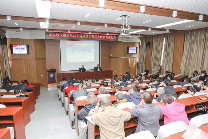 为深入学习贯彻习近平新时代中国特色社会主义思想,进一步推动“不忘初心、牢记使命”主题教育和全面从严治党向纵深发展,10月17日下午,机关党总支邀请校纪委副书记宋传文为全体党员作党风廉洁警示专题报告。报告会由机关党总支委员、安全保卫部主任王胜禹主持。