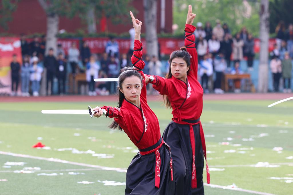 4月25日上午8时,仪仗队、护旗手、运动员、各代表方队昂首挺胸、顺次入场,在庄严的国歌声中全体人员起立,注视五星红旗冉冉升起。随后信息系、经济系、文法系分别作汇报表演。信息系以《逐梦之星》开场,拳与扇的结合,刚柔并济、动静结合,充满了飘逸潇洒的美感与武术的阳刚威仪;经管系《粉墨书剑》,婉转清丽,舞姿婀娜,剑指处,缓若流云,疾如劲风,谱写一幅快意江湖;最后以文法系啦啦操《舞动芳华》收尾,步调轻快,积极向上,彰显“运动·健康”主题,展现文法学子独特的青春与活力。