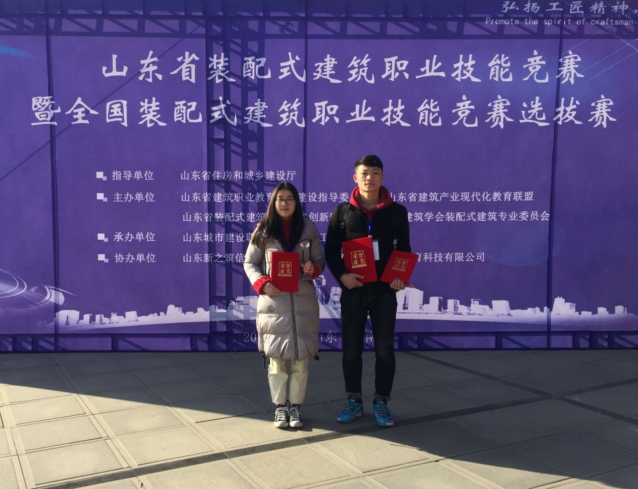 2019年1月19日,在济南工程职业技术学院举办了山东省首届装配式建筑职业技能竞赛暨全国装配式建筑职业技能竞赛选拔赛,大赛分为职工组和学生组,全省有近百名学生和技术工人聚集于此。我校代表队(队员:张倩倩、刘志红,指导老师:尹发利)荣获团体三等奖,其中团队成员张倩倩、刘志红分别获得个人三等奖,成功入围中国技能大赛“三一杯”首届全国装配式建筑职业技能竞赛。