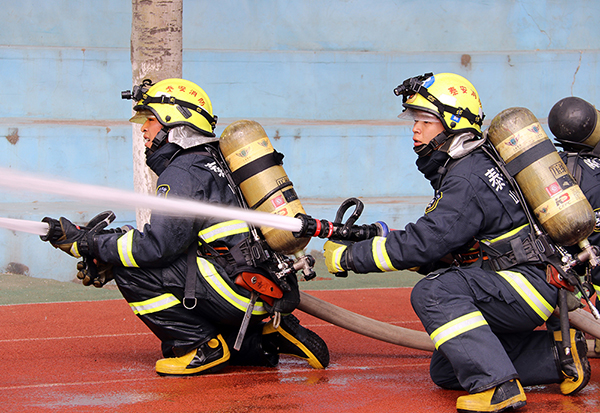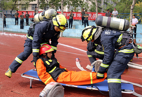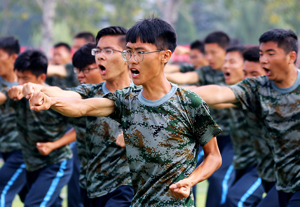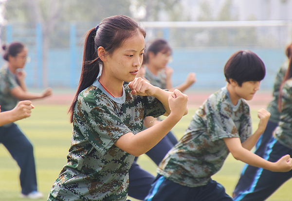 随着王少鹏的一声“开始!”,护旗队护送“军训团”旗帜走向主席台,一列列方队迈着整齐的步伐接受领导和首长的检阅。站军姿、踢正步,新生的一声声呐喊,迸发出青春和热血的活力;一句句嘹亮的口号响彻天空,展现出不畏困难的青春气息。“格斗准备——杀”,女子擒敌拳队列跑进操场草坪中央,她们踢腿刚劲有力,动作整齐划一,巾帼不让须眉的风采引得掌声不断;男子方队的擒敌拳呐喊声气吞山河,出拳虎虎生威,用肃整的军容展示军训成果。泰安市公安消防支队消防官兵作纵深灭火操表演,通过破拆防盗门,闯过模拟坍塌区安全救助被困人员,成功处置火灾。
