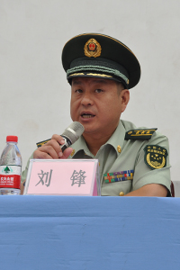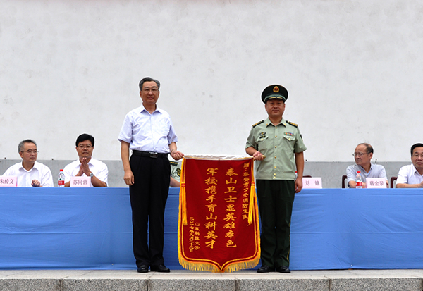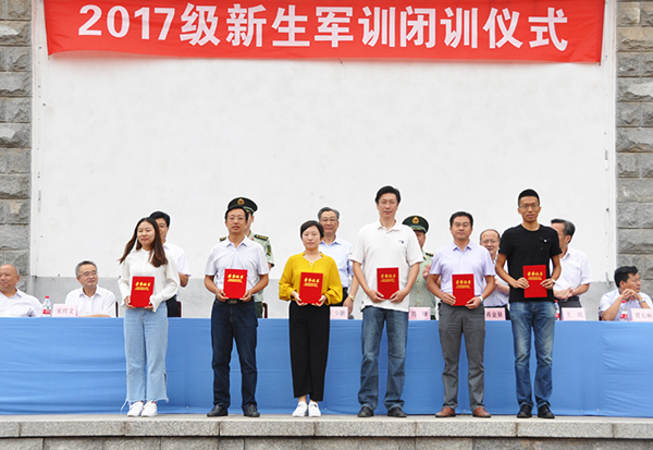王少鹏向承训部队赠送锦旗,刘锋宣布“优秀军训班”、“优秀教导员”、“优秀教官”表彰名单,对资土系军训大队等8个军训班、吴天南等11位教导员、刘富强等11位教官进行表彰。