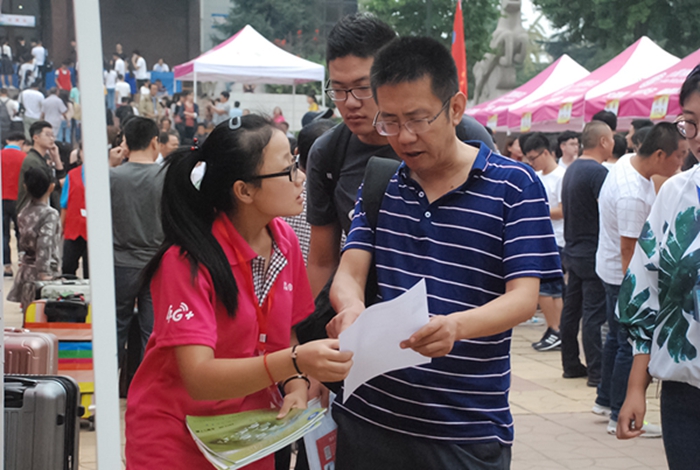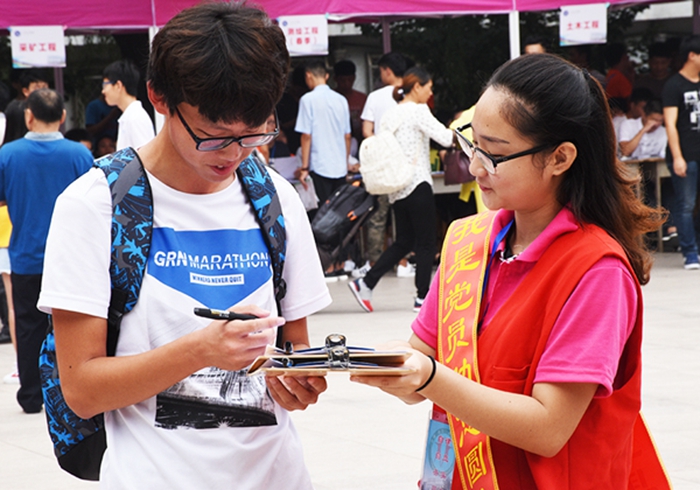 在迎新现场,志愿者们不停地穿梭在校园中,他们在车站边、道路旁迎接来自各地的新生,抢着为新生拎包、拖运行李箱,并向他们介绍校内的情况和学习、生活情况。尽管已经到了秋天,但中午的阳光依然炎炎灼人,来来回回忙碌的他们,人人满头大汗。为了方便新生,他们不仅在现场解决了午饭,而且一直到晚上8点多,部分志愿者还在现场做着服务工作。采访中,笑容灿烂的志愿者张翰文表示:“身为新生的学长有义务为新生做好相应的指导帮助,看到每一位新生能够顺利报到入学,心里感到非常开心。”
