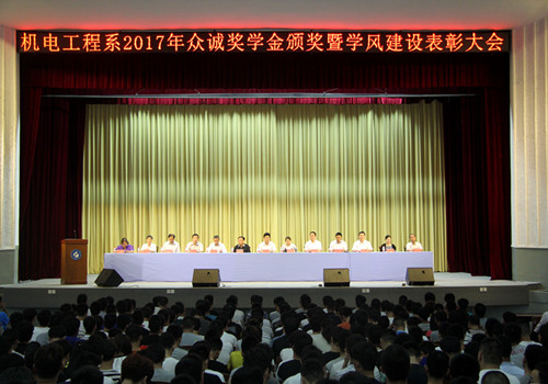 6月5日,泰安校区在东校园礼堂召开2017年众诚奖学金颁奖暨学风建设表彰大会。校区、学院党委副书记苏同营,众诚自动化设备股份有限公司人事总监王晶及市场总监卢广军,校区、学院学生工作处处长黄德杰,教务处副处长卢军及机电系党政领导班子成员出席大会并在主席台就座,机电系1500余名学生参加大会。大会由机电系党总支书记张建中主持。