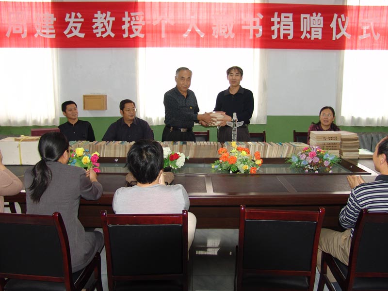 9月29日下午在文法系资料室举行周建发教授个人藏书捐赠仪式。周建发教授将自己多年来珍藏的图书260余册、自己整理汇编的资料25本、杂志8本、著作摘录卡片一盒无偿地捐赠给文法系资料室。文法系系主任张学银接受了周教授的捐赠,并代表文法系向周教授赠送了纪念品。