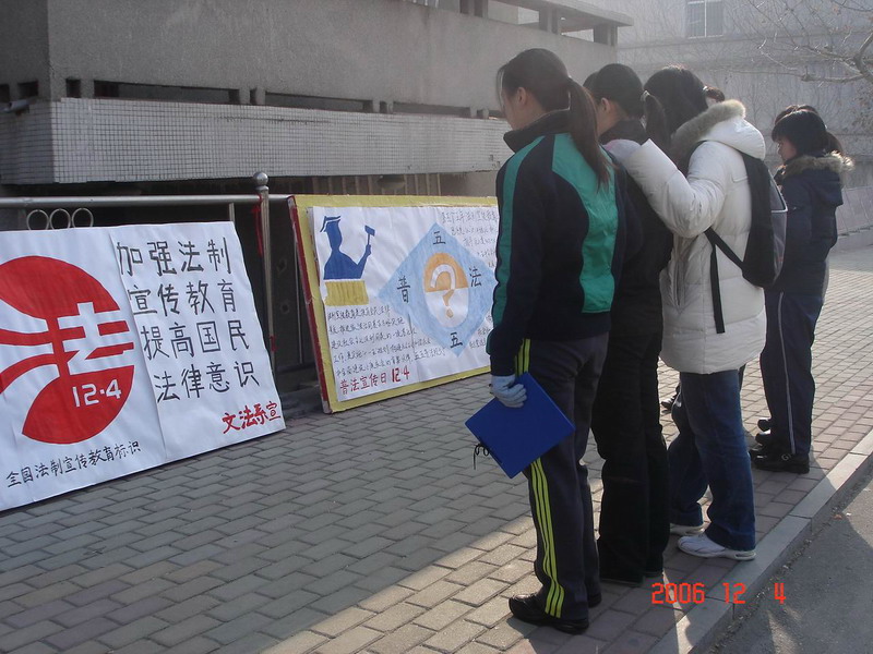 为迎接2006年‘12·4’全国法制宣传日,做好‘12·4’全国法制宣传日宣传活动。文法系深入开展“五五”普法规划宣传活动,广泛宣传法律法规知识,营造师生学法、知法、懂法、用法的良好氛围。