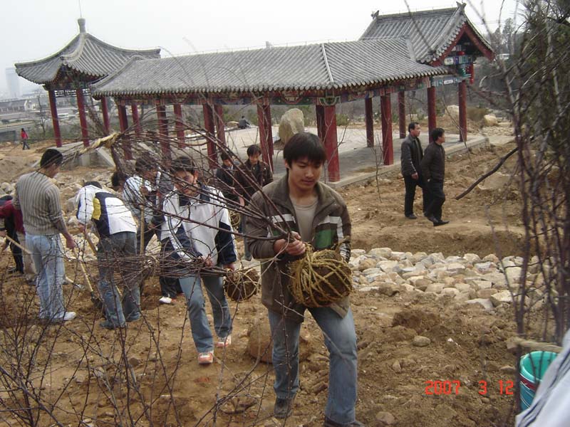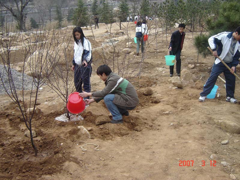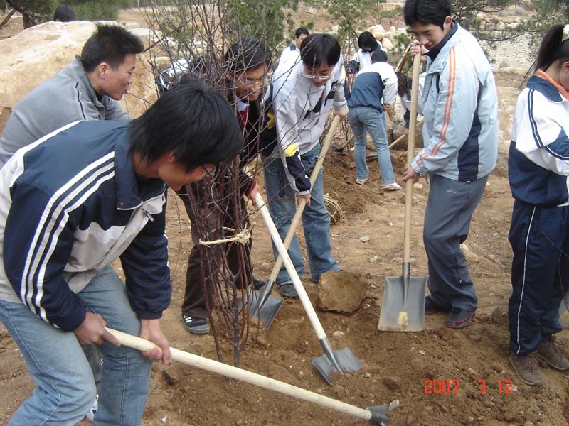 在和煦的春风中,志愿者们踏着整齐的步子来到天外村游园,泰山景区团工委书记侯欣达对同学们的到来表示热烈欢迎,他给同学们讲了种植树苗的详细过程及注意事项。同学们分组后在景区负责人陈文成的指挥下,按照分配的任务以积极的心态、高涨的情绪投身到劳动中。同学们有的往山坡上运树苗,有的挖树坑,有的提水,即使是大汗淋漓脸上依然流露着笑容。历时三个小时的劳动,天外村游园的每个角落里几乎都留下了同学们的足迹,同学们看到自己的劳动成果后都倍感自豪。