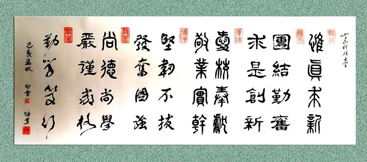 童培孚教授曾任我校党委委员、宣传部部长、泰安市社科联副主席,退休后继续坚守初心,担当作为,关爱学生成长,热心公益事业,是全省高校退休干部先进个人。空暇之余,笔耕不辍,创作了大量思想内容、艺术形式俱佳的书法作品。这些书法作品,记录着一个老教育工作者多年跋涉的足迹,展现着其立德树人的精神追求,也把一个慈祥长者老骥伏枥、爱生爱校、追求卓越的人生姿态以书法形式,或显或隐地外化出来。