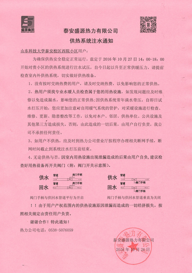 附:泰安盛源热力有限公司《供热系统注水通知》