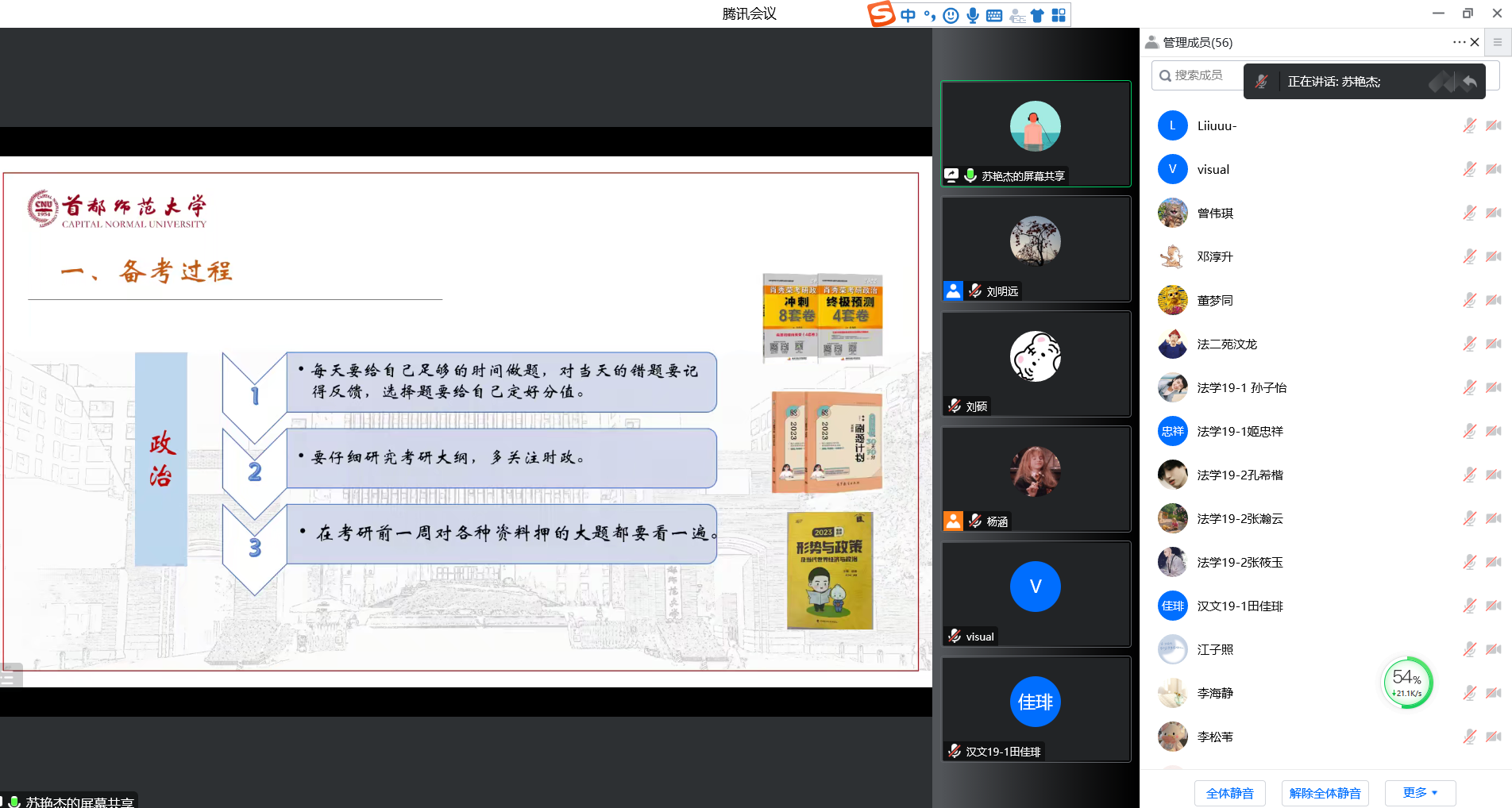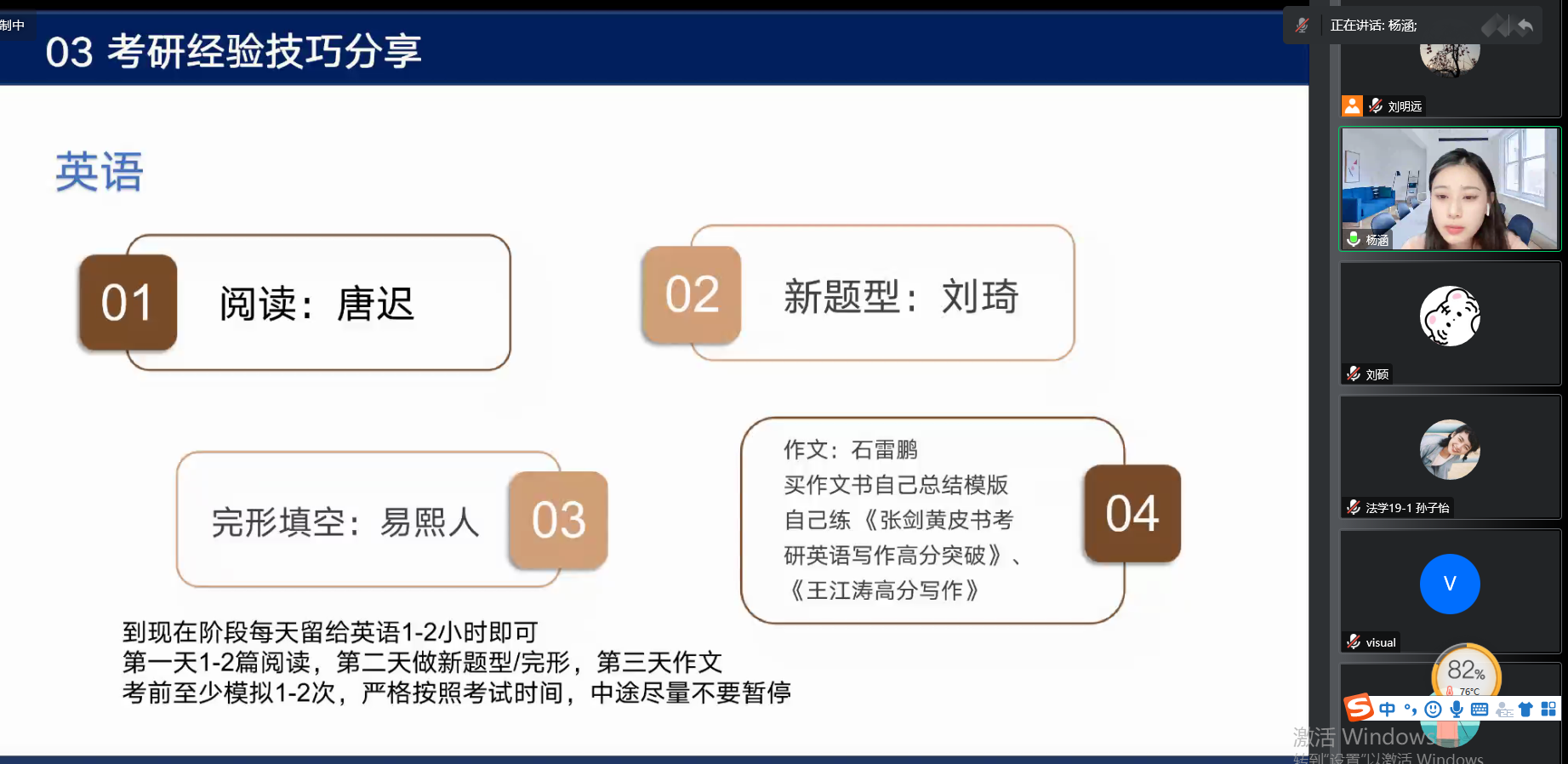 会上,刘明远首先对三位同学在本科期间取得的成绩以及研究生期间的学习、工作情况进行简要介绍。随后,杨涵、刘硕和苏艳杰三名同学分别结合自身备考经验,围绕择校、专业选择、初试备考、复试、调剂等方面全方位、多层次地向大家做了详细的介绍,并就如何制定高效的冲刺计划、缓解备考压力等问题,为同学们提供了参考。最后,针对考研过程中的困惑,学长学姐们耐心解答,鼓励备考的同学们树立信心,保持良好的心态,不断提高学习效率。