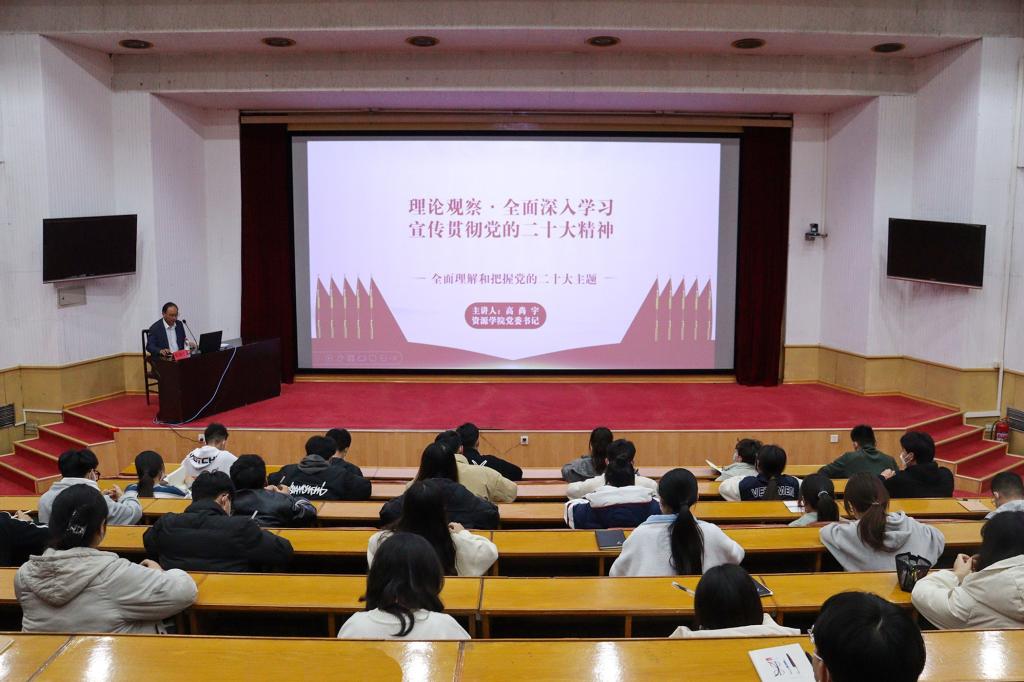 11月23日,资源学院党委书记高尚宇在四号楼报告厅做“全面理解和把握党的二十大主题”报告,该报告同时作为学院第37期入党积极分子培训班党课第一讲。