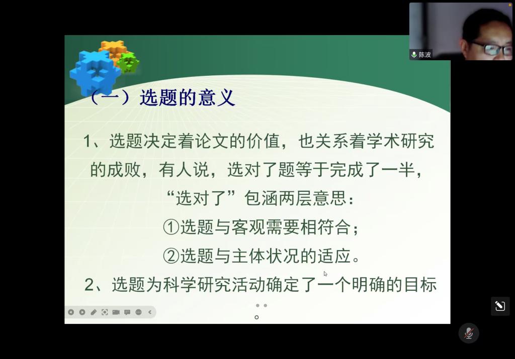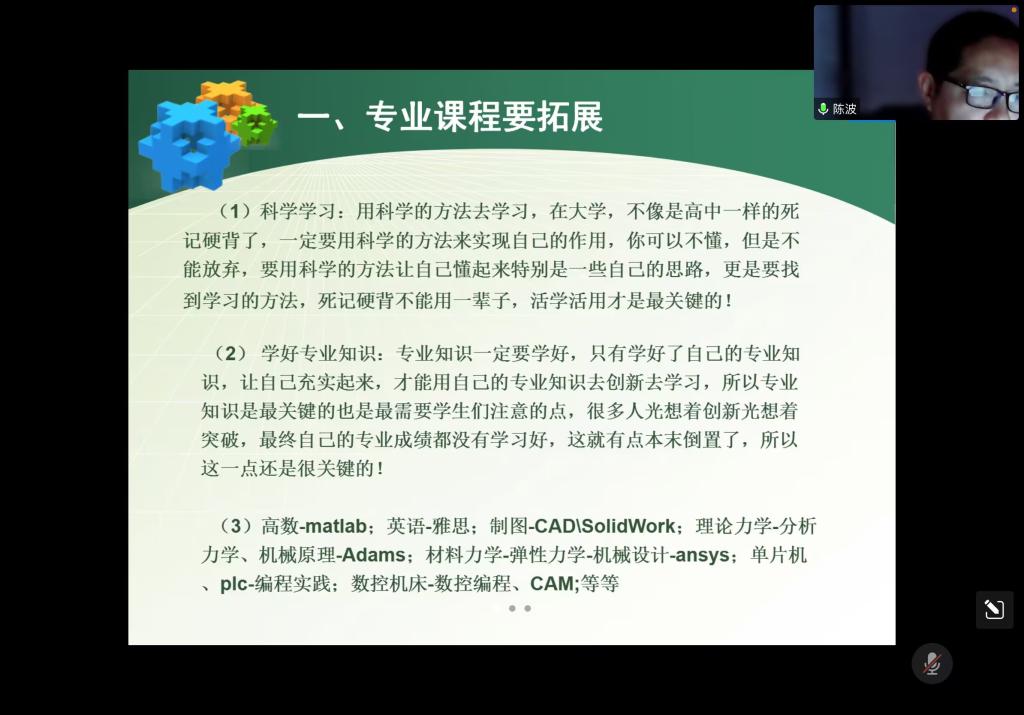 为强化同学们科技创新意识、提高科技创新能力,近日,智能装备学院于线上视频会议的方式开展第三届大学生科技创新大讲堂第三讲。本次讲堂邀请到智能装备学院副教授、硕士生导师陈波担任主讲教师,智能装备学院部分学生参加。