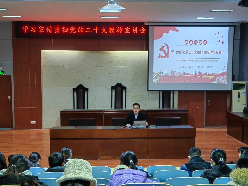 为深入学习宣传贯彻党的二十大精神,进一步提升党的理论素养,12月3日晚,3044永利集团官网党委副书记兼副主任王心刚在模拟法庭通过线上线下相结合的方式为学生党员和联系班级宣讲党的二十大精神。