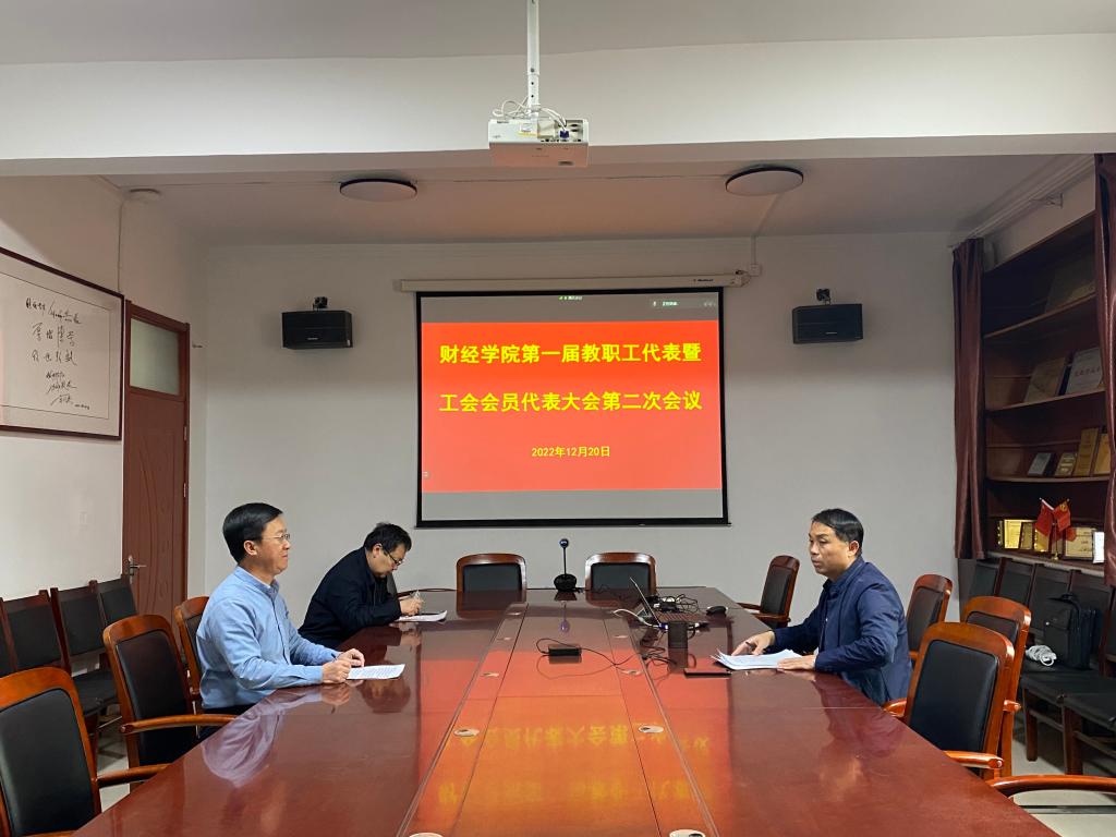 12月20日下午,财经学院召开第一届教职工代表暨工会会员代表大会第二次会议,会议通过线下线上相结合的方式进行,学院党委副书记兼副院长刘凯主持会议。