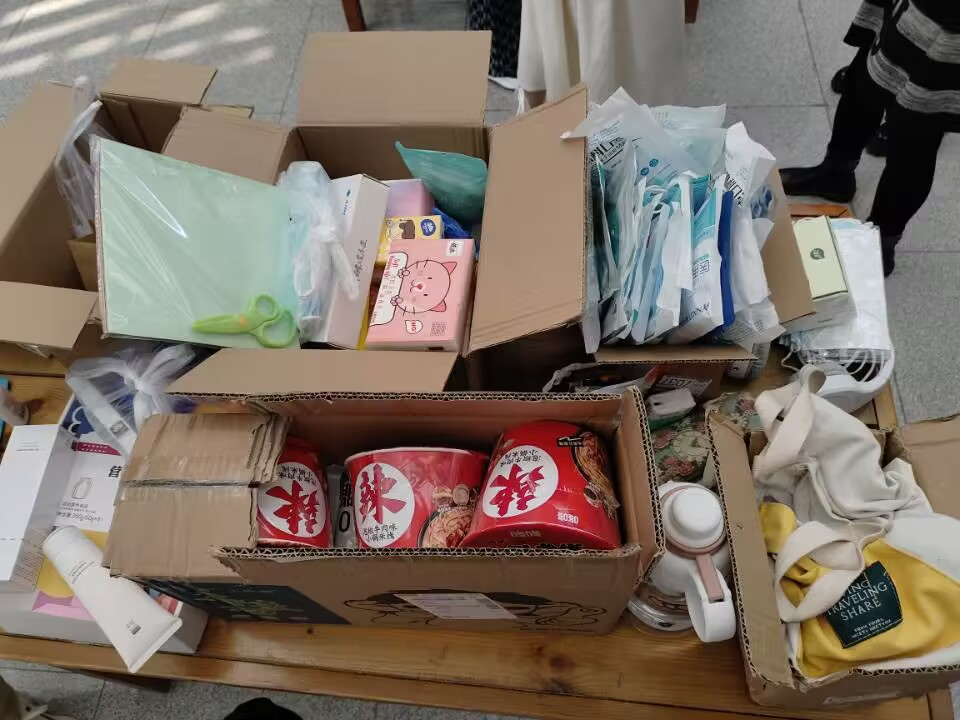 活动过程中,参与人员排队有序进行捐赠,物资以卫生纸、消毒湿巾、常用药品等生活用品及中性笔、笔记本等学习用品为主。捐赠物品结束后,工作人员对物资进行整合,在教学楼中建立爱心传递箱,所有同学均可以在箱中拿取物品或进行补充。
