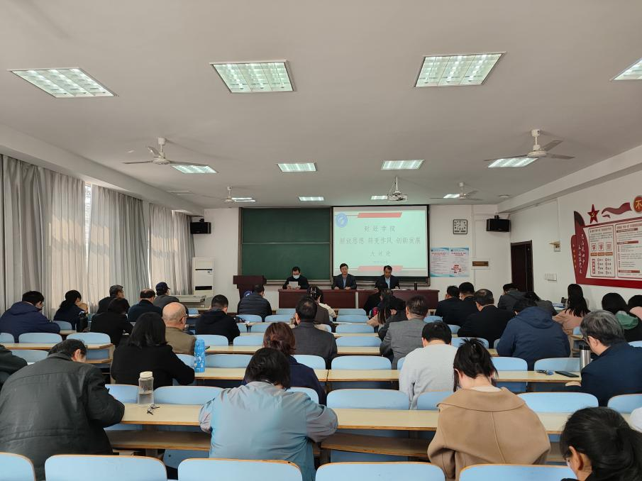 随后,刘庆志院长传达了学校3月17日各中层单位主要负责人会议主要内容,校党委书记罗公利、校长曾庆田的讲话精神,传达了校区2023年度工作要点,校党委常委、组织部部长陈涛在校区2023年度工作会议上的讲话精神。并结合学院实际,就做好“解放思想 转变作风 创新发展”大讨论活动,对全院教职工提出三点要求:一要提高站位,统一思想认识。要深入学习宣传贯彻党的二十大精神、学校(校区)的工作要点和校领导的讲话精神,把思想和行动统一到学校(校区)的决策部署上,进一步解放思想,更新观念,转变作风,激发学院发展的内生动力。二要实事求是,突出重点难点。要直面学院和教职工个人在思想观念、人才培养、教学科研、学科建设、师资队伍、管理服务、工作作风等方面存在的“低燥懒散平软”等突出问题,明确发展目标和思路举措,着力做到“五破除五强化”。三是聚焦主业,确保目标实现。要积极融入学校“强工、厚理、精文”、特色文科振兴计划和校区“立足实际、守正创新、突出特色、错位发展”的发展思路,不断创新工作思路和方法举措,确保学院在“十六项重点工作”中取得新成效实现新突破,推动学院高质量发展。