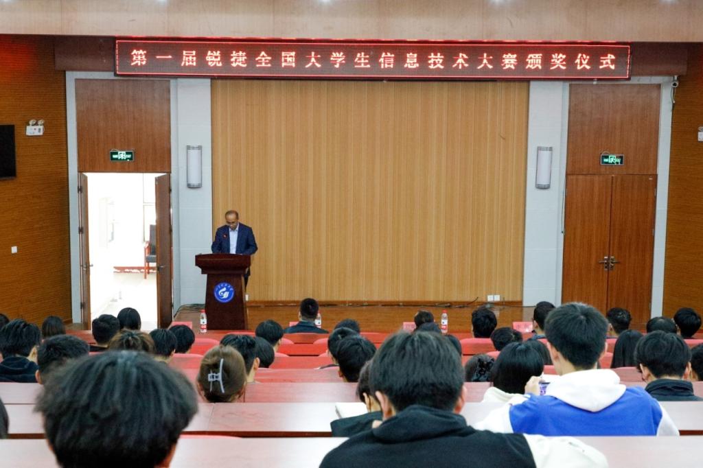 颁奖仪式伊始,谢清勇介绍了首届锐捷全国大学生信息技术大赛的整体赛况,来自全国36个战队共计108名选手参加了决赛阶段的比赛,最终学院两支代表队荣获第一名和第三名的好成绩,并被授予优秀组织院校。学院副院长赵慧奇、锐捷ICT人才教育中心拓展部经理张红涛为获奖学生和优秀指导教师颁发了奖杯和荣誉证书。