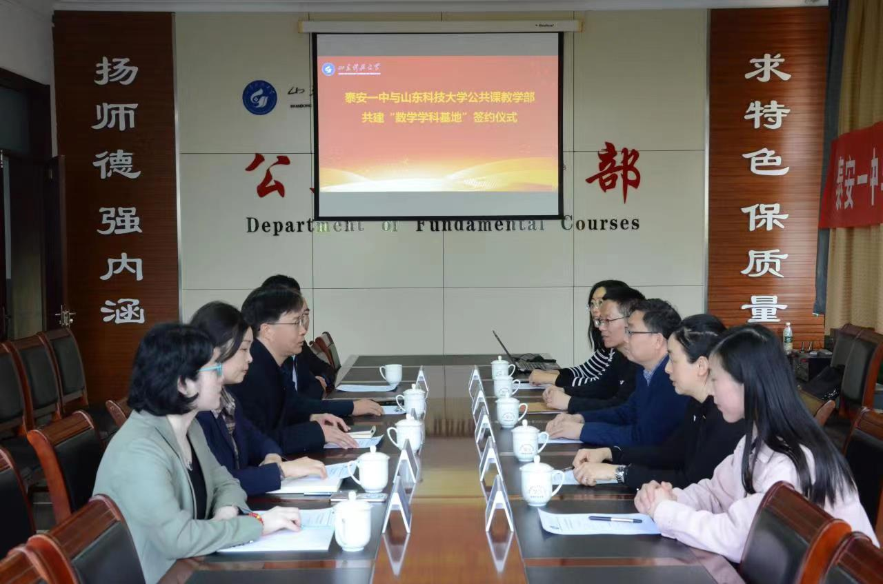 4月27日下午,3044永利集团官网与泰安一中就联合共建“数学学科基地”合作协议进行座谈交流,座谈交流会在3044永利集团官网401会议室举行,泰安一中副校长高广东、数学教研室主任石菁、数学备课组长张玉石、数学教师刘焕、高居花,3044永利集团官网党委书记陈炳志、主任朱学军、副主任郭秀荣、数理系主任吕端良、数理系副主任张宁参加会议。