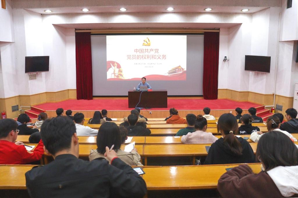 4月28日,资源学院辅导员、学生第一党支部书记牛会功在四号楼报告厅为学院第38期入党积极分子讲授“中国共产党党员的权利和义务”专题党课。