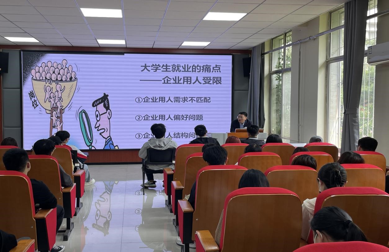交流会伊始,邵长亮首先详细分析当前的大学生就业现状,引导同学们树立就业意识、转变求职观念、提升求职技能、做好毕业规划。随后,邵长亮结合自身工作经历分享就业经验,以两会中“就业”这个关键词为切入点,引出就业群体庞大所带来的众多就业问题。为此,他向大家提出了“坚持自立自强”、“转变就业观念”、“积极灵活就业”三点建议。最后,邵长亮鼓励同学们增强自信心,克服就业焦虑,在就业行动上积极争取,在心态上保持乐观,以忘我之精神,求术业之精深。在交流互动环节中,同学们踊跃提问,邵长亮针对同学们提出的问题进行了耐心细致的解答。